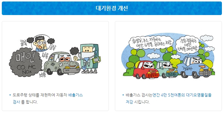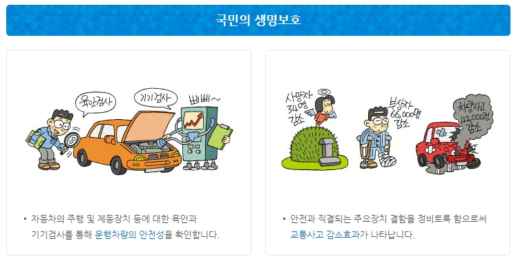 이용하는 자동차의 안전도 적합여부와 배출가스 허용 기준을 확인하기 위한 절차입니다. 주기적인 자동차 검사로 인해서, 자동차 안전과 함께 환영오염까지 챙길 수 있도록 하기 위한 제도입니다.
