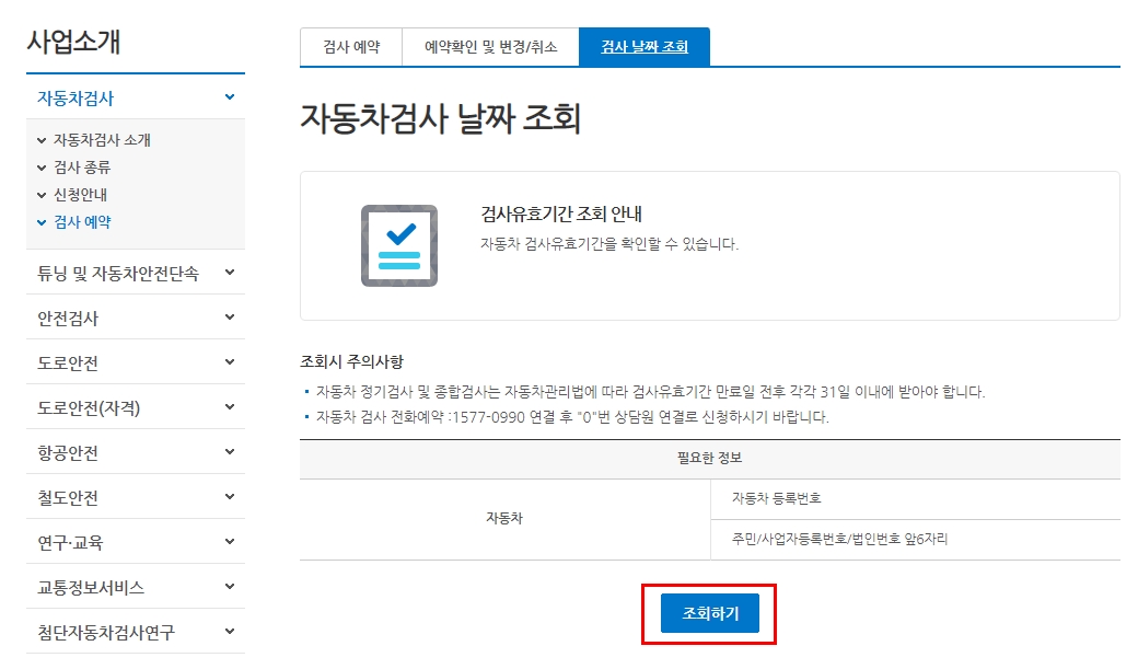 자동차검사 날짜 조회 검사유효기간 조회 안내 자동차 검사유효기간을 확인할 수 있습니다. 조회시 주의사항 자동차 정기검사 및 종합검사는 자동차관리법에 따라 검사유효기간 만료일 전후