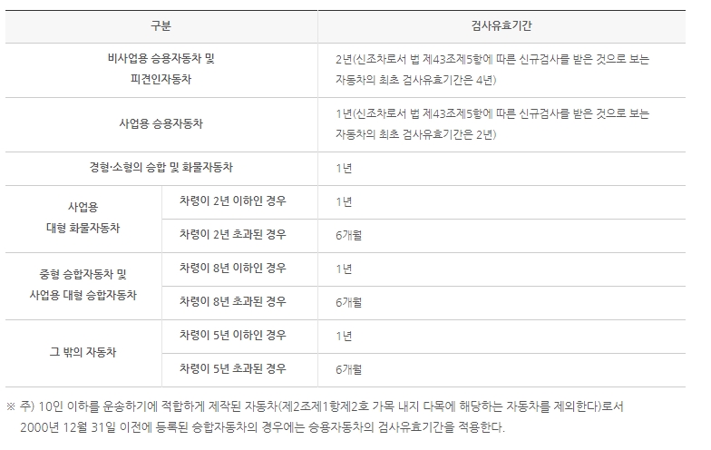 기본적으로 과태료가 부과되는 기준은 검사 유효 기간을 기준으로 하고 있습니다. 기간에 경우는 구분에 다라서 상이하게 적용되고 있습니다. 사업용 여부, 소형, 중형, 대효에 대해서도 구분이 세부적으로 구분되어 있습니다. 기본적으로는 2년 단위로 자동차 검사 유효기간이 적용됩니다.
