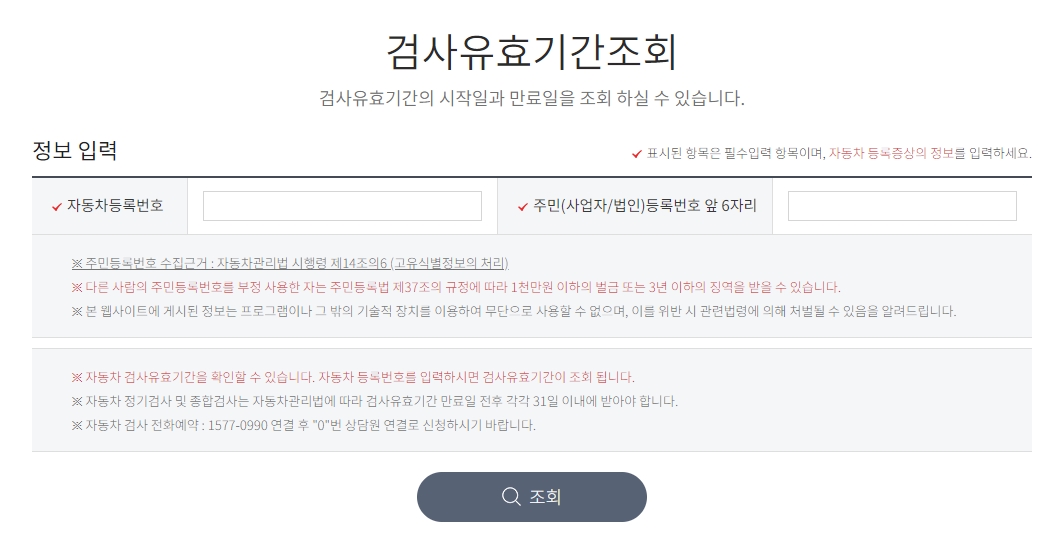 해당 페이지에서 조회하기 버튼을 클릭하시면 자동차 검사 유효기간에 조회 할 수 있는 페이지로 이동하게 됩니다. 그리고 검사하기 위해서는 주요 정보가 필요합니다.