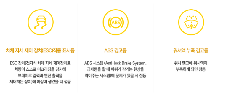 그리고 대부분에 경고등은 노란을 많이 보셨을꺼라고 생각합니다. 해당 경고등이 나오면 당황하지 않고 빠른 시일 내에 정비소에 방문하여 점검을 받으시면 됩니다. 노란색 경고등 종류가 다양하지만 해당 경고등이 나온다고 바로 주행에 문제가 되지 않습니다.