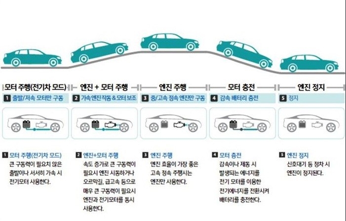 그렇기 때문에 일반적은 100% 연료를 사용하는 자동차에 비해서 하이브리드 자동차가 뛰어난 연비를 자랑하는 것입니다. 저속 모터 모드에 속도는 차종 별로 상이 할 수 있다고 합니다.