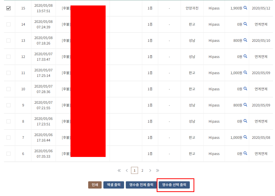 이렇게 다양한 내역 중에서 내가 원하는 내역만 선택하여 상세 내역을 확인 할 수 있습니다. 추가적으로 출력을 희망하는 내역을 선택하고 "영수증 선택 출력" 버튼을 클릭하시면 해당 내역에 대한 하이패스 영수증 출력할 수 있습니다.