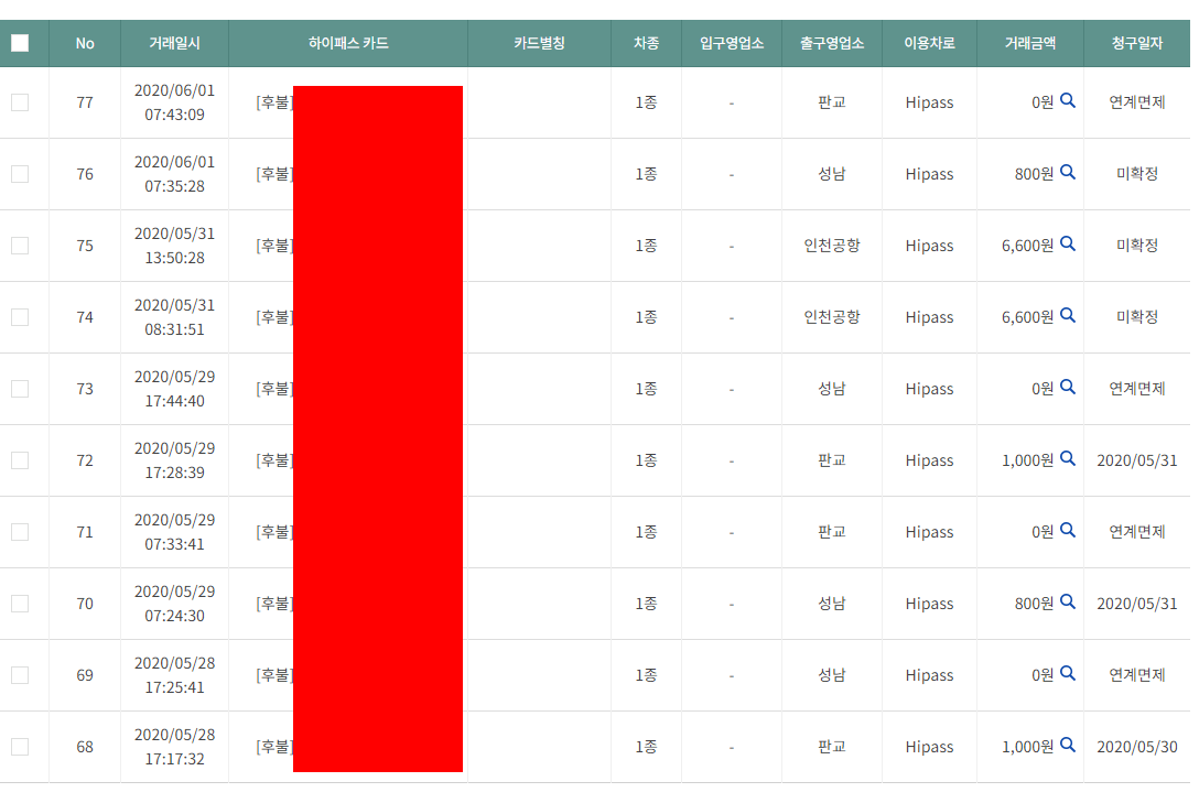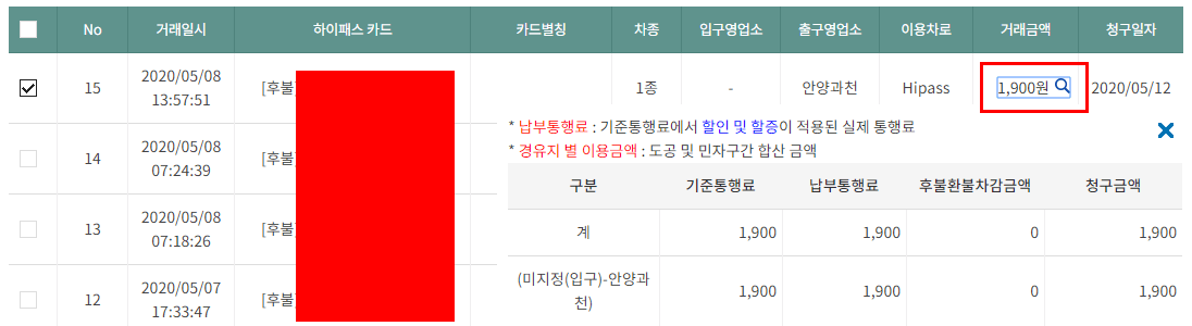 그리고 조회 기간을 선택하신 후에 조회 버튼을 클릭하시면 하위 데이터 테이블 영역에 하이패스 영수증 출력할 수 있는 이용 이력이 노출됩니다.