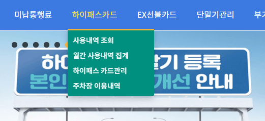 고속도로 통행료 사용내역 조회, 미납 통행료 납부, 하이패스 단말기 등록, 하이패스 단말기 명의변경 및 해지, 선후불 카드신청, 통행료 환불