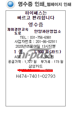 웹페이시 인쇄 페이지를 통해서 출력되는 영수증 출력 규격에 대해서 확인 할 수 있습니다. 하이패스 영수증에 세부적인 정보들이 노출되고 있습니다.