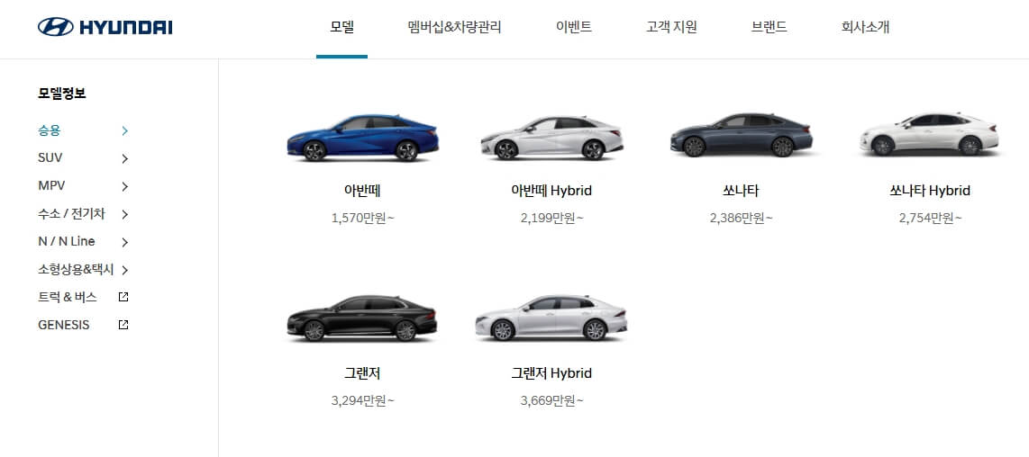 이상으로 현대자동차 공식 홈페이지에서 종류 별 모델과 기본적인 정보를 확인해보았습니다. 해당 포스팅은 자동차 구매를 고민하거나, 내가 구매하려는 자동차가 어떤 종류인지 확인하는 정보로 활용되면 좋지 않을까 싶습니다. 감사합니다.