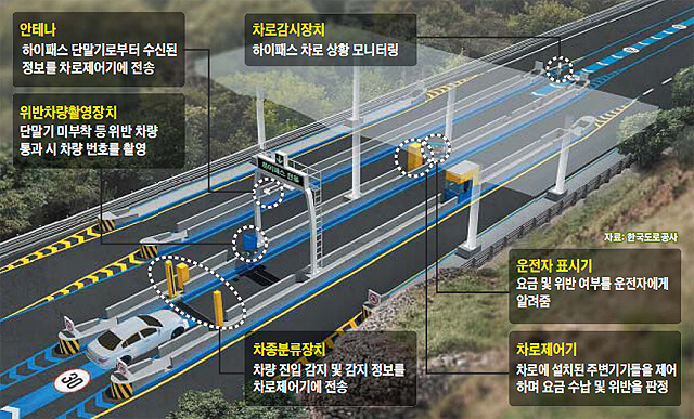 심플하게는 근거리 통신 장비를 통해서 내 자동차에 등록되어 있는 하이패스 단말기를 통해서 요금을 선정하게 됩니다.